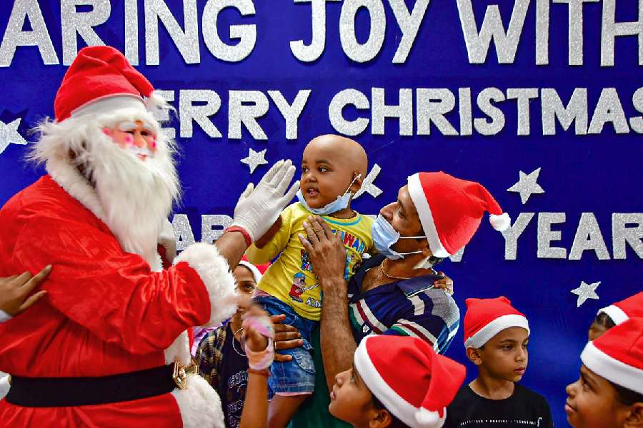 A man dressed as Santa Claus with children at Bai Jerbai Wadia Hospital during Christmas celebration, in Mumbai.