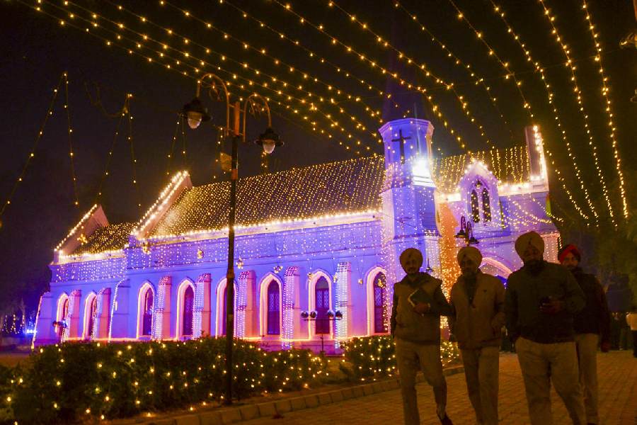 St. Paul's Church is illuminated during Christmas festivities, in Amritsar.