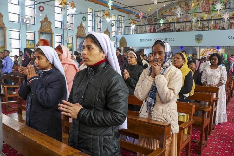 Devotees offer prayers at a Catholic Church on the occasion of Christmas, in Patna.