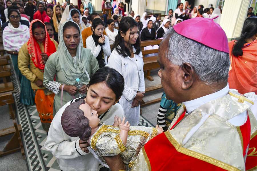 A Christian devotee kisses a statue of Baby Jesus during the Christmas celebration at Don Bosco Catholic Church, in Tezpur, Sonitpur district, Assam.
