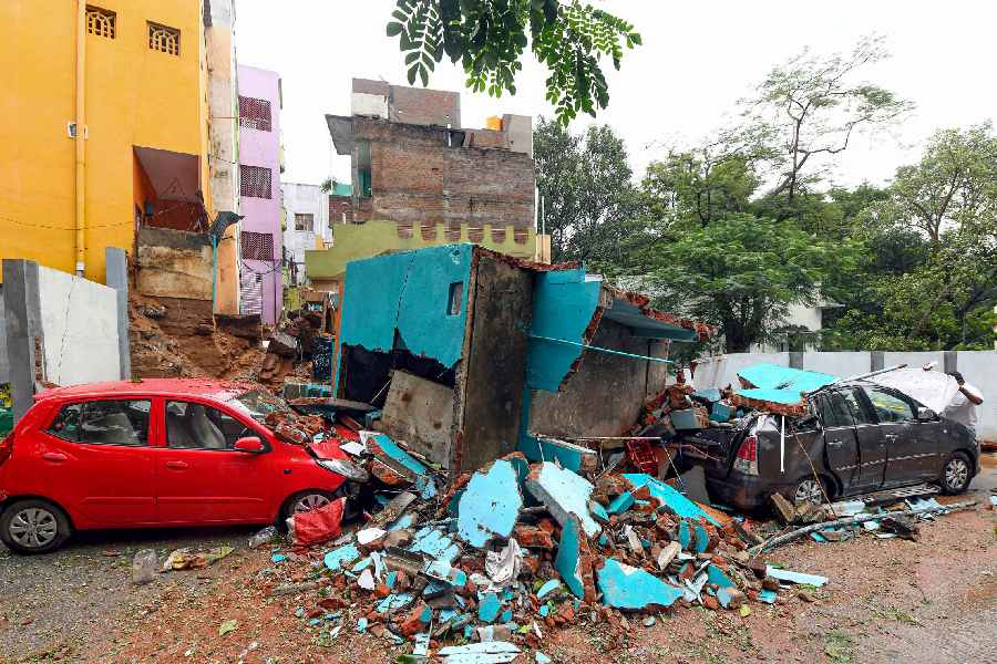 Debris of a collapsed structure covers vehicles parked near it after the landfall of the cyclone, in Tirupathi, Andhra Pradesh.