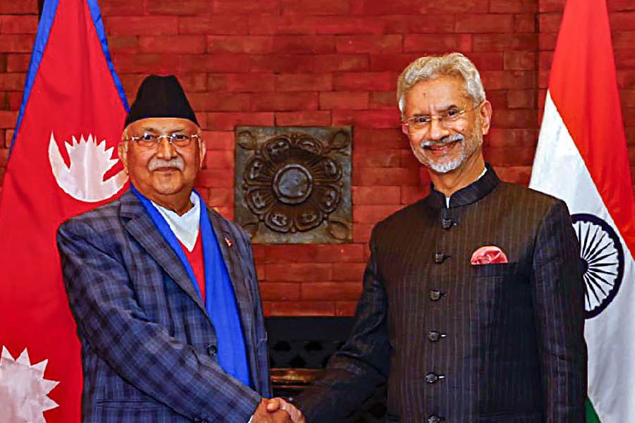 External Affairs Minister S. Jaishankar with former PM of Nepal KP Sharma Oli during a meeting.