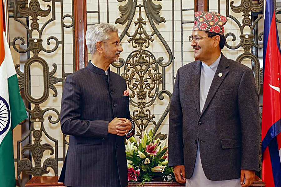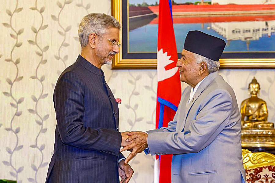 Nepal's President Ramchandra Paudel with External Affairs Minister S. Jaishankar during a meeting, in Kathmandu.
