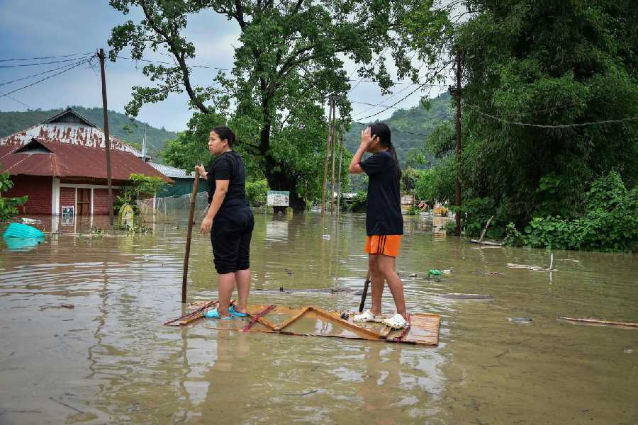 Cyclone in India and Bangladesh: Girls row a makeshift raft to reach a safer place after heavy rains caused by Cyclone Remal in Imphal, Manipur, India, May 29, 2024. Cyclone Remal made landfall between Sagar Island in West Bengal and Bangladesh’s Khepupara on the night of May 26. While Bengal’s coastal areas did take a knock, the cyclone left a bigger trail of devastation in the states of the North East.