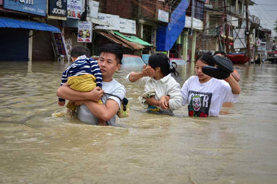 Cyclone in India and Bangladesh: A man carries his child through a flooded area to a safer place after heavy rains caused by Cyclone Remal in Imphal, Manipur, India, May 29, 2024. At least 58 persons were killed across Mizoram, Manipur, Assam, Nagaland and Meghalaya as rain triggered by the cyclone led to floods, landslides, and widespread damage to homes.