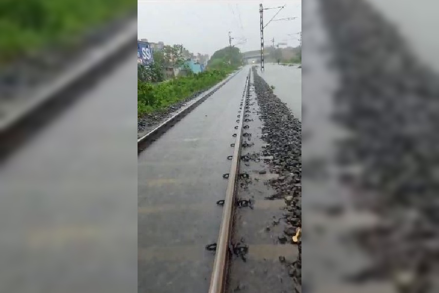 A railway track filled with water somewhere near VOC Nagar railway station. Several lines are completely under water.