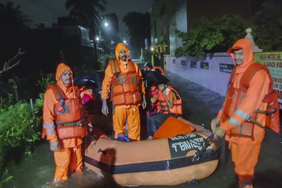 NDRF personnel evacuate residents from a flooded area after heavy rain owing to Cyclone Michaung, in Tambaram.