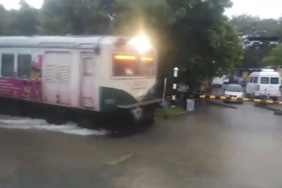 A train runs on a waterlogged railway track after heavy rain owing to Cyclone Michaung.