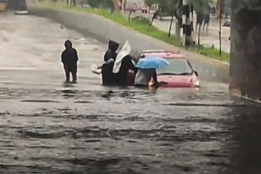 People push a car stuck at a waterlogged underpass after heavy rainfall.