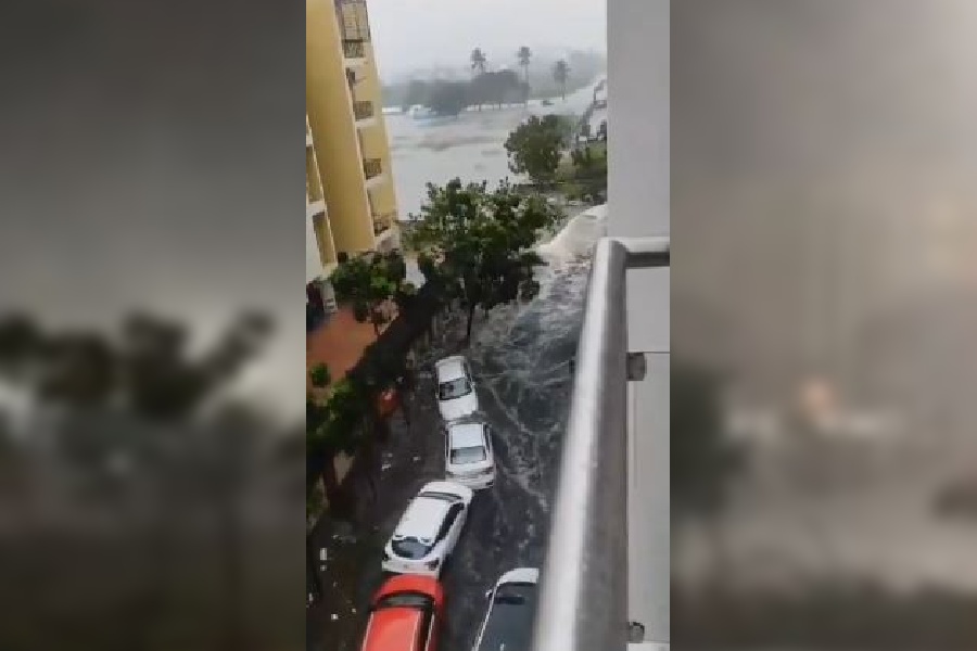 Commuters on a waterlogged road during heavy rain owing to Cyclone Michaung.