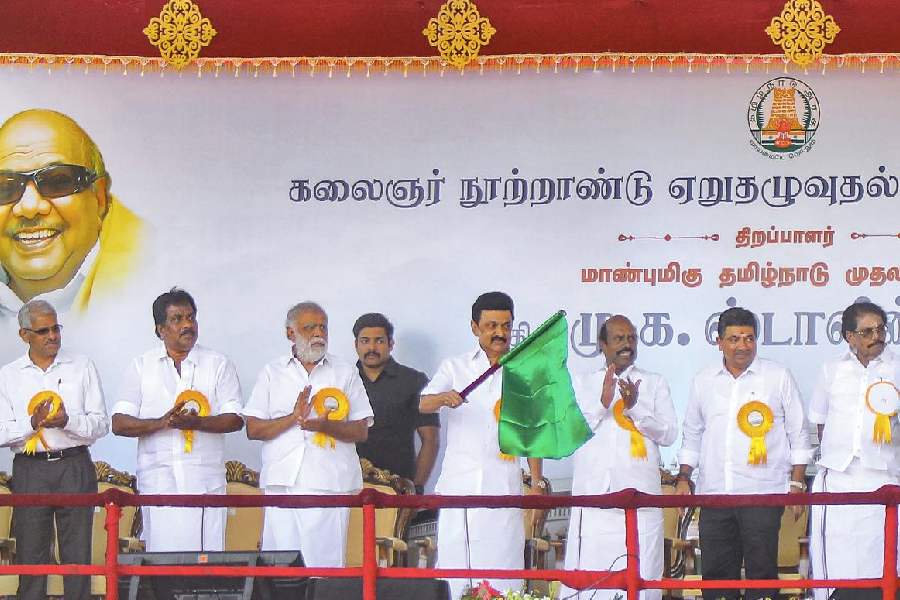 Tamil Nadu Chief Minister M.K. Stalin during the inauguration of a 'Jallikattu' arena named after his father and former state chief minister M. Karunanidhi, in Madurai district.