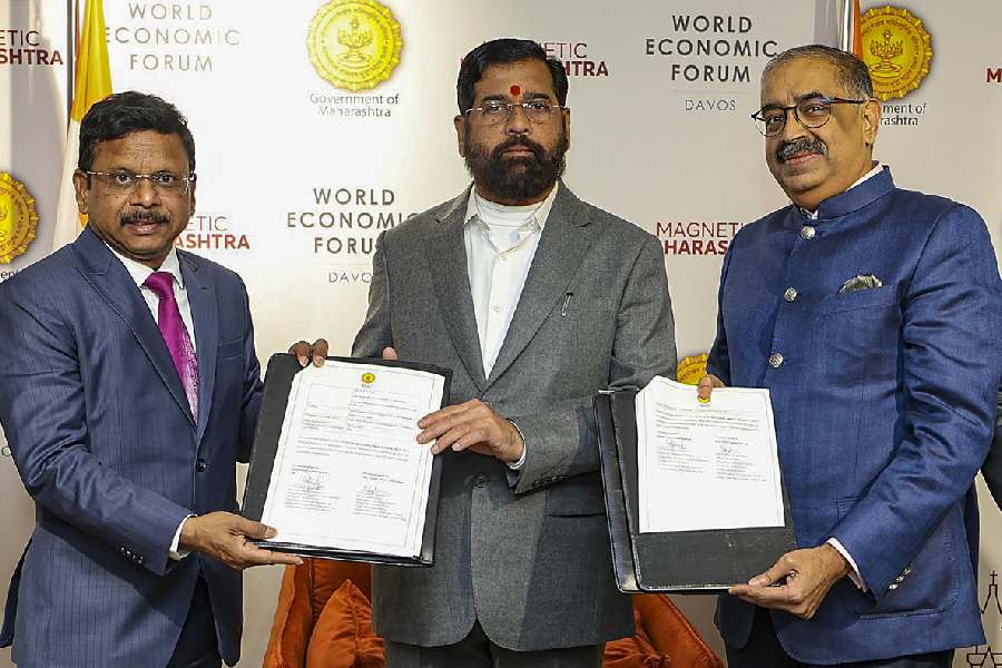 Maharashtra Chief Minister Eknath Shinde during the signing of a memorandum of understanding between the state government and Lloyd Metals Company on the sidelines of the World Economic Forum (WEF) Annual Meeting, in Davos, Switzerland. Maharashtra government secured investment MoUs worth Rs 3.53 lakh crore (USD 44 billion) this week at the WEF Annual Meeting.