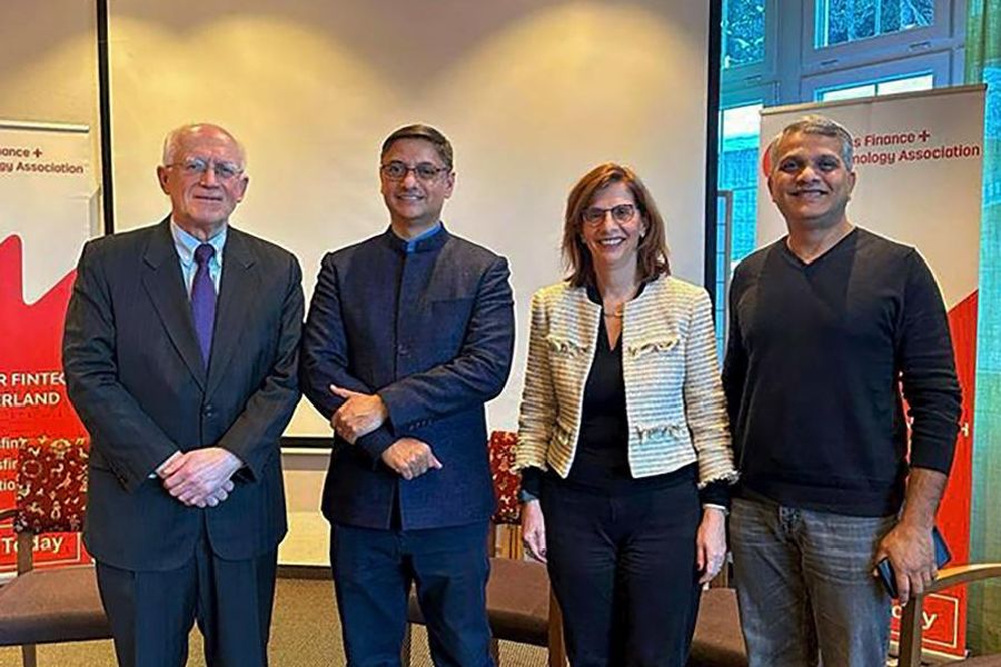 Economic advisor to PM Modi Sanjeev Sanyal, Swiss banking leader Phillip Weights, Swiss fintech influencer Efi Pylarinou and Entrepreneur and Investor Ashok Ranadive during a panel discussion on 'India’s Digital Public Infrastructure and It’s Role in Reducing Inequality with Specific Focus on UPI' at Davos Innovation Week, in Davos. The Karnataka government during the WEF meeting has signed MoUs with investment proposals to the tune of ₹22,000 crore with seven companies.