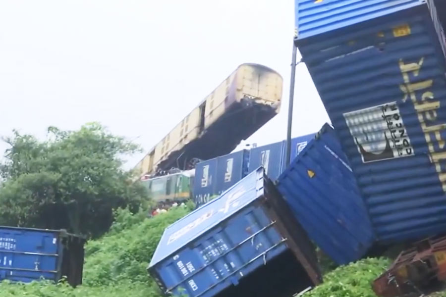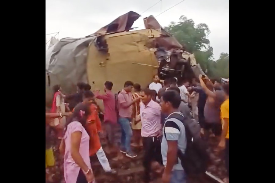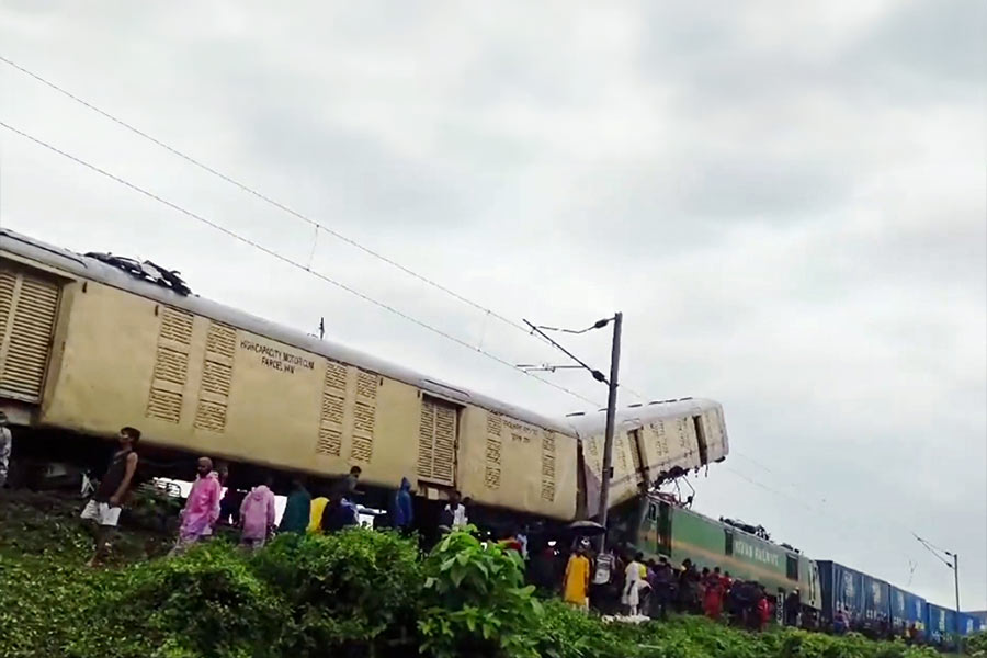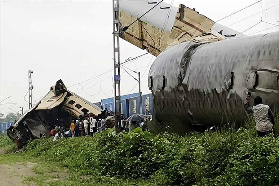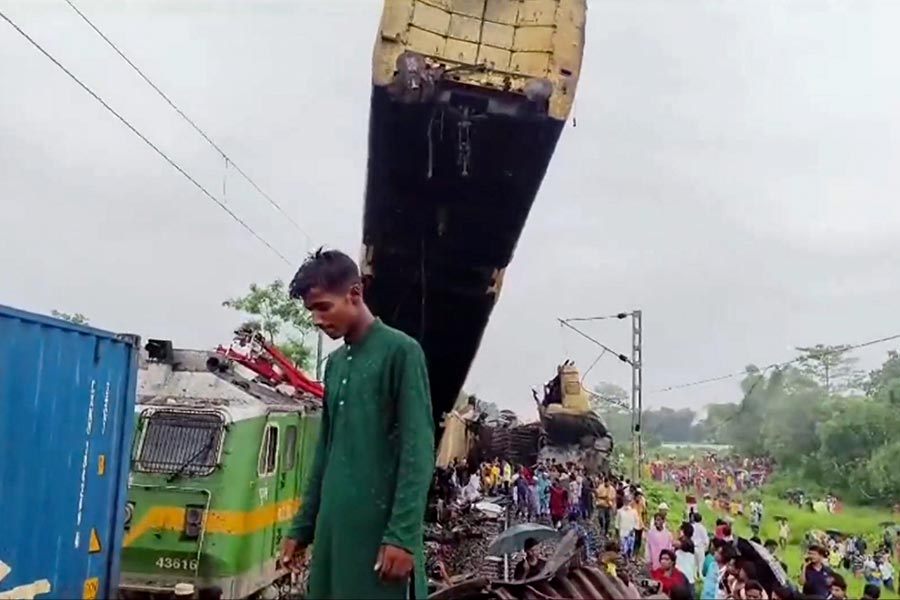 Locals gather after a collision between the Kanchanjungha Express and a goods train, near Rangapani railway station, on Monday, June 17, 2024. The incident has once again highlighted the critical need for stringent safety measures in the railway sector to prevent such tragedies.