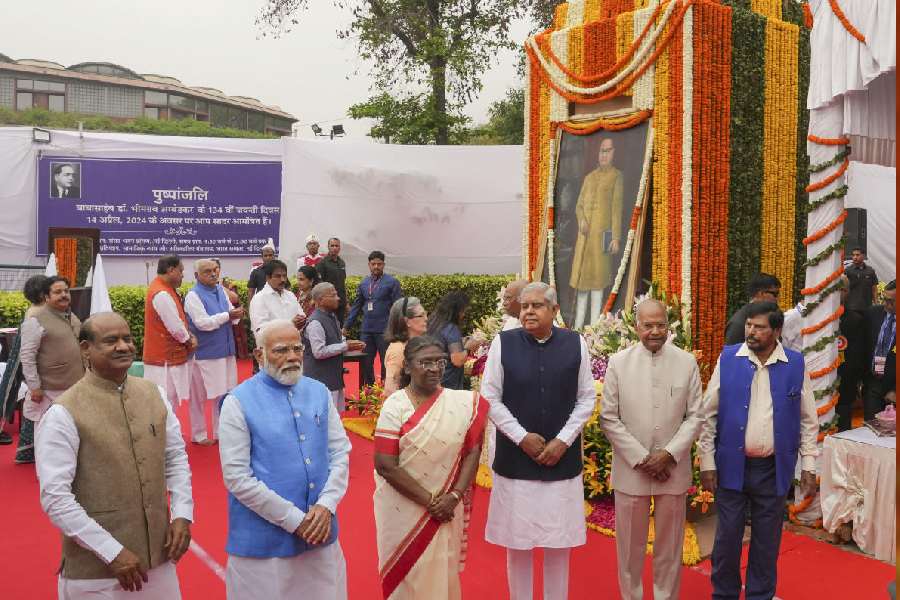 President Droupadi Murmu, Vice President Jagdeep Dhankhar, Prime Minister Narendra Modi, Lok Sabha Speaker Om Birla and others during Ambedkar Jayanti celebrations, at Parliament in New Delhi. "On the occasion of the birth anniversary of Babasaheb Bhimrao Ramji Ambedkar, the architect of our Constitution and one of the most eminent nation builders, I extend my warm greetings and best wishes to all fellow citizens," the president said in a statement.