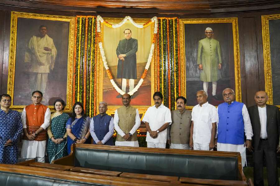 Lok Sabha Speaker Om Birla with Congress MPs K C Venugopal, Rajeev Shukla and BJP MPs Meenakashi Lekhi, Rakesh Sinha, and others after paying tribute to BR Ambedkar on his birth anniversary, at Parliament. Birla hailed Ambedkar as a great nation builder and said his life was synonymous with a unique struggle for social justice.