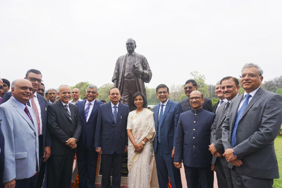 Chief Justice of India DY Chandrachud with wife Kalpana Das, Chief Justice of Singapore Sundaresh Menon and others after paying tribute to BR Ambedkar, the architect of the country's Constitution, on his birth anniversary, at the Supreme Court. Ambedkar was the architect of our Constitution who brought about a complete social transformation. And his message continues to be as valid today as it was when he was drafting the Indian Constitution," the CJI said.