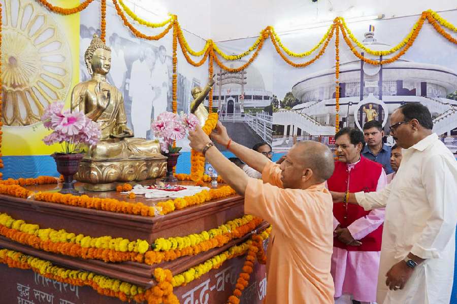 Uttar Pradesh Chief Minister Yogi Adityanath pays tribute to BR Ambedkar, the architect of the country's Constitution, on his birth anniversary, in Lucknow.