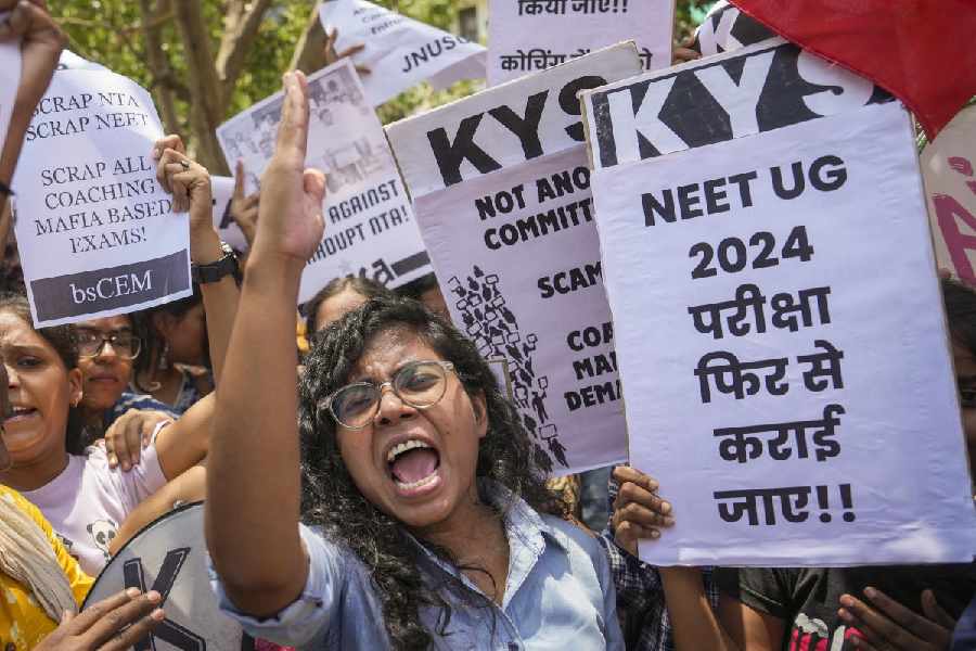 Members of student organisations stage a protest against the alleged irregularities in the NEET-UG 2024 entrance exam result, in New Delhi, Monday, June 10, 2024. Students across the country have taken to the streets to protest against the alleged irregularities in the NEET-UG 2024 entrance exam results. The issue has captured national attention and reignited debates surrounding the fairness of the examination process.