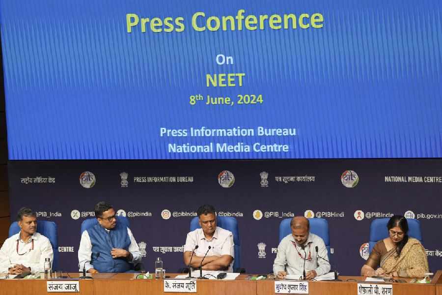 National Testing Agency (NTA) Director General Subodh Kumar Singh along with K Sanjay Murthy, Secretary, Department of Higher Education, during a press conference regarding NEET-UG medical entrance exam results, in New Delhi, Saturday, June 8, 2024. The National Testing Agency's (NTA) decision to form a four-member panel to review the awarding of grace marks to more than 1,500 candidates has done little to quell the rising discontent.