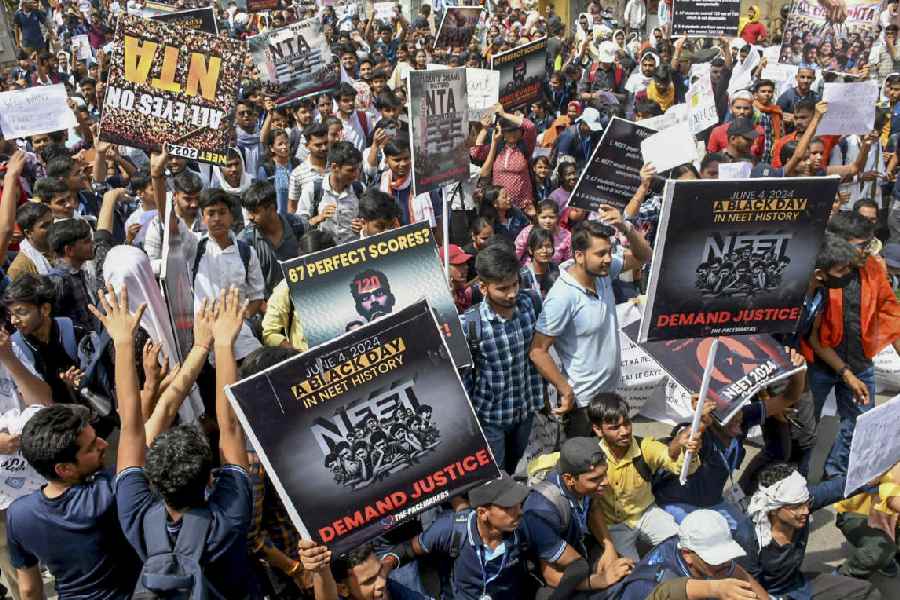National Student Union of India (NSUI) members stage a protest against the National Testing Agency (NTA) over the alleged irregularities in the NEET-UG 2024 entrance exam results, in Bhopal, Saturday, June 8, 2024. With over 24 lakh candidates registering for NEET-UG this year, the scale of the controversy is unprecedented. Sixty-seven candidates had shared the first rank in the exam including eight from the same centre in Haryana.