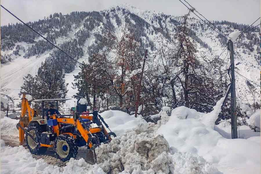 A snow clearing machine being used to remove snow from a road at Sissu, in Lahaul and Spiti district. Over 650 roads, including five national highways, in the state remained closed for vehicular movement following several avalanches and landslides caused by incessant rain and snow for the past three days.