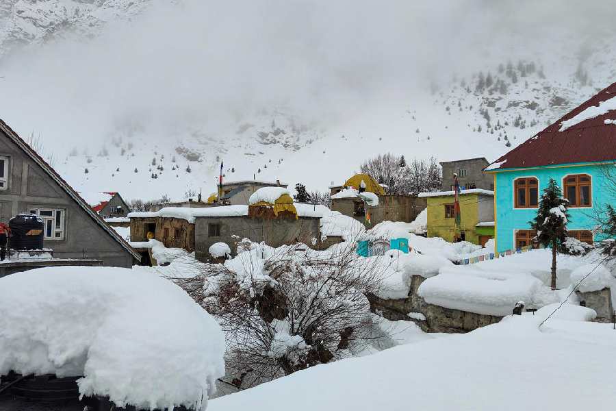 Houses at Rashil village are seen covered in snow after fresh snowfall, in Lahaul and Spiti district. About 290 roads are blocked in Lahaul and Spiti district and several areas are without electricity for the past two days.