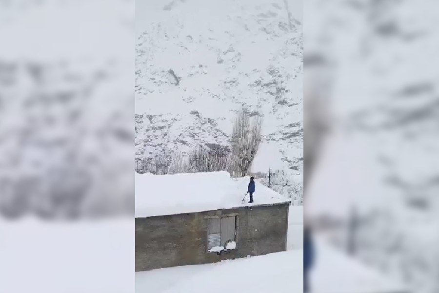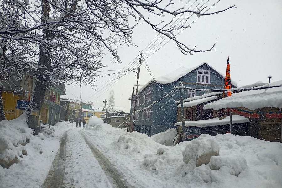 A snow covered street amid snowfall at Udaipur village, in Lahaul and Spiti district. Heavy rain and snow in Lahaul and Spiti has also disrupted the mobile network.