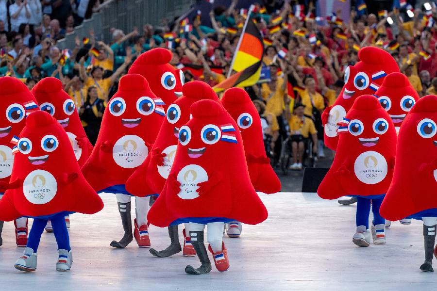 The Paralympic mascot the Phryge perform in front of the Obelisque de Louxor (Luxor Obelisk) at the Place de la Concorde during the Paris 2024 Paralympic Games Opening Ceremony in Paris on August 28, 2024.