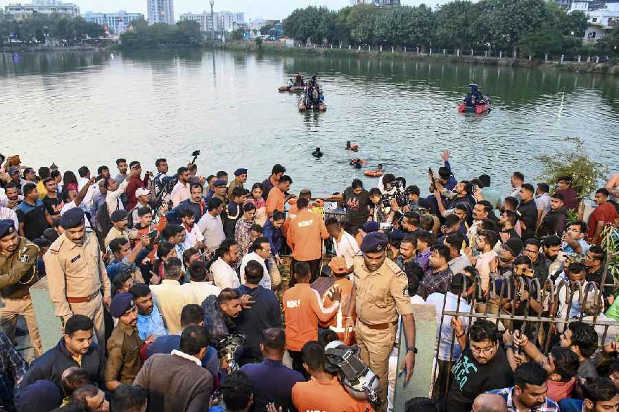 Rescue officials during a search operation in the lake. The National Disaster Response Force (NDRF) and the fire brigade personnel are on the job along with other agencies. Search and rescue operation at the site continued with the help of deep divers, SONAR and under-water cameras.