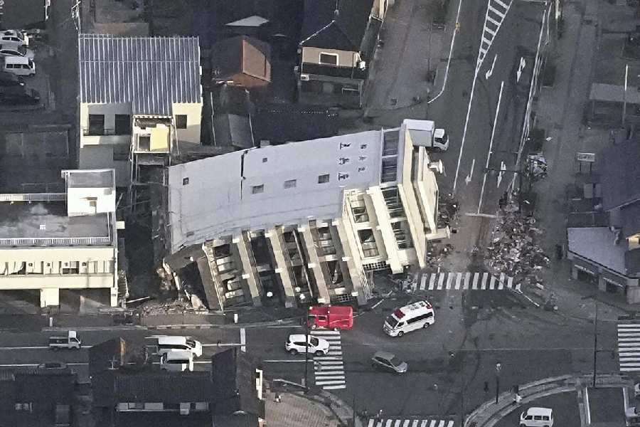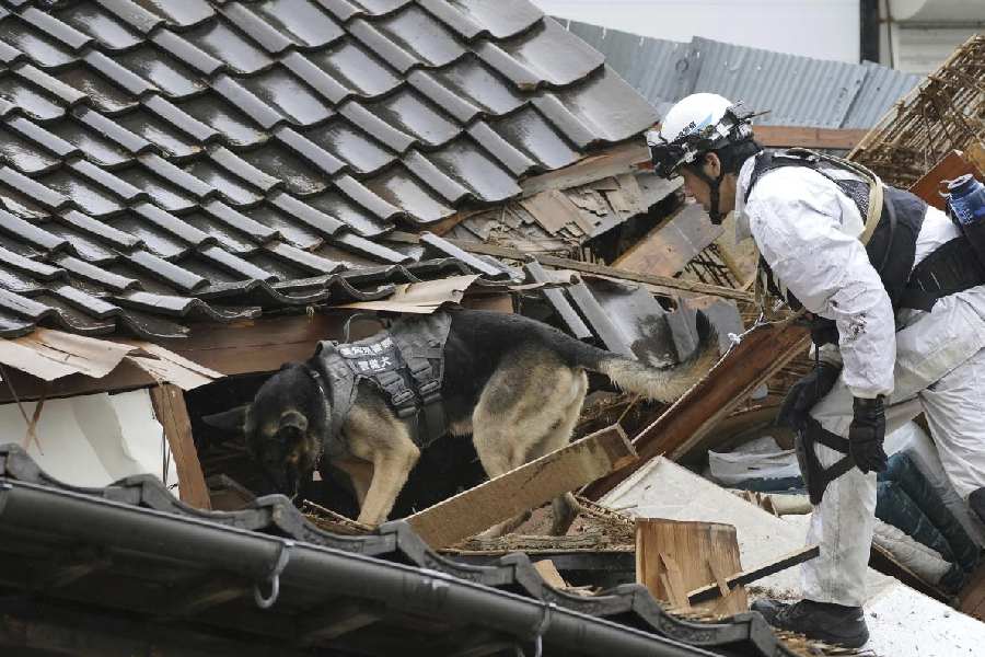 A police officer and a canine dog search a collapsed house following earthquakes in Wajima, Ishikawa prefecture. Ishikawa prefecture and nearby areas were rattled by a major 4.9 magnitude aftershock in the early hours among the dozens of aftershocks that have followed a magnitude 7.6 temblor two days ago.