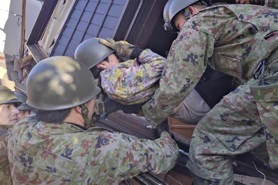 Japanese Self Defense Force members carry an injured person out of a collapsed house, following strong earthquakes in Wajima. Water, power and cell phone service were still down in some areas.
