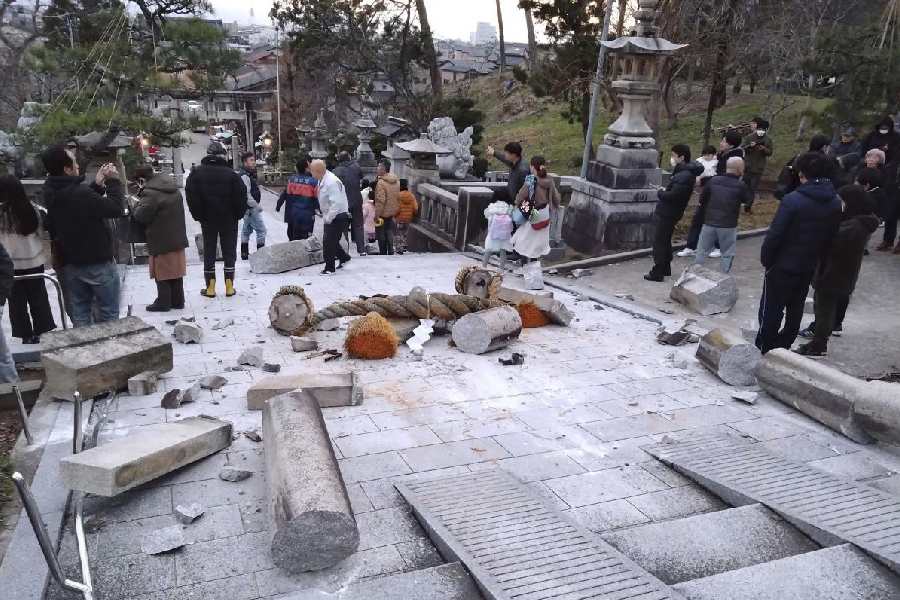 A torii gate is damaged after an earthquake at a shrine in Kanazawa. Relief officials were delivering water, blankets, food and other supplies.