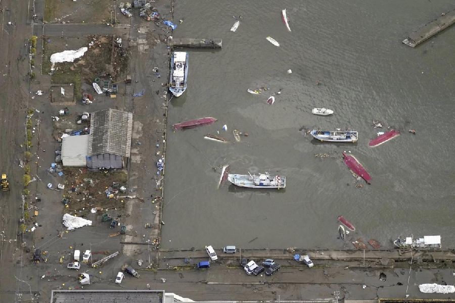 Overturned fishing ships at a port following earthquake in Suzu. A series of powerful earthquakes in western Japan damaged homes, cars and boats.