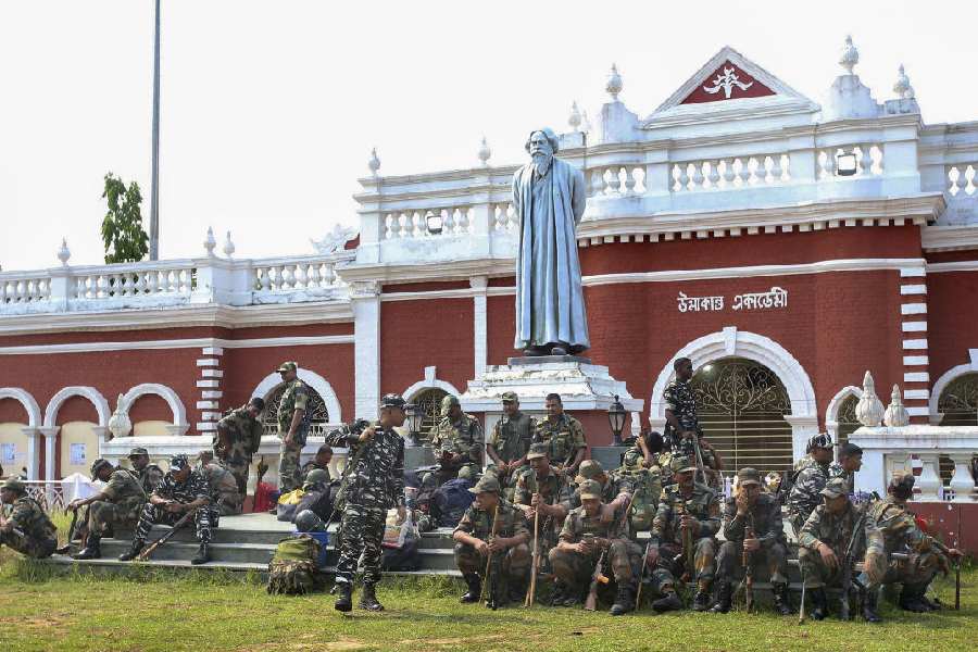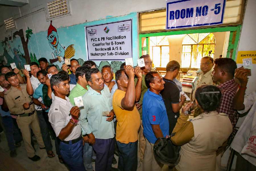 Police personnel at a distribution centre before leaving for their respective polling stations ahead of the first phase of voting for Lok Sabha elections, in Agartala. “Central paramilitary forces will be deployed at all polling booths, while other forces will also be made available to ensure peace during the polling day. Webcasting will be made from all booths,” Returning Officer of the Tripura West Parliamentary constituency Vishal Kumar said.