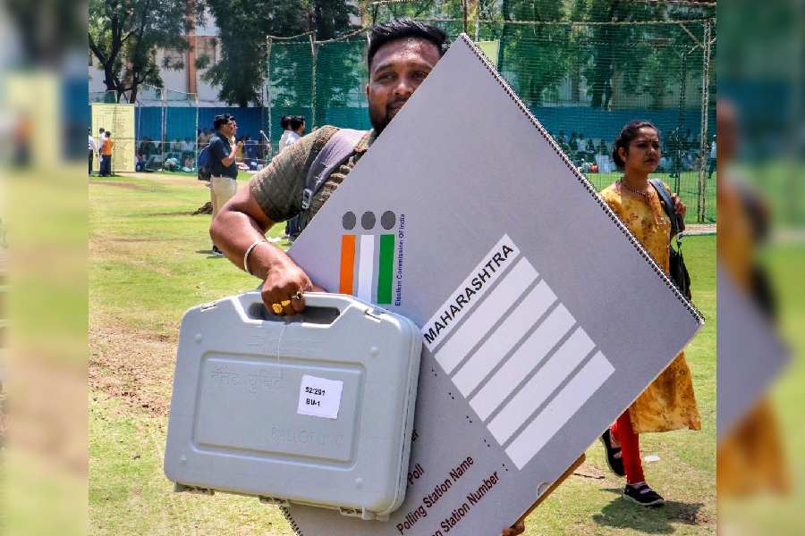 A polling official carries an Electronic Voting Machines (EVM) and other election material at a distribution centre on the eve of the first phase of Lok Sabha elections, in Nagpur. In Nagpur, a direct fight is on cards between Union minister and senior BJP leader Nitin Gadkari and Congress' Vikas Thakre.