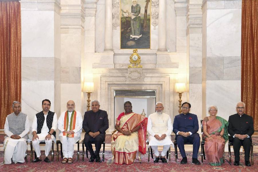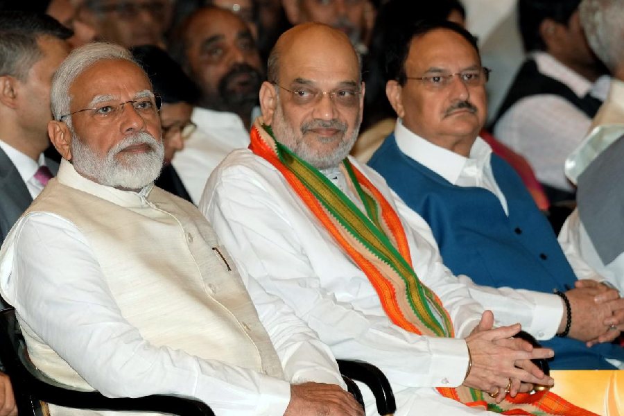 Prime Minister Narendra Modi with Union Home Minister Amit Shah and BJP National President J.P. Nadda during a ceremony for presentation of Bharat Ratna, at Rashtrapati Bhavan, in New Delhi. This year, the government announced five Bharat Ratna awards, including one to Bharatiya Janata Party (BJP) stalwart and former deputy prime minister L K Advani.