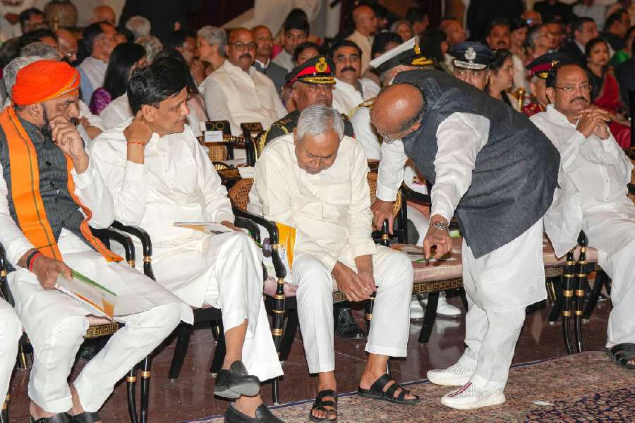Former vice president M. Venkaiah Naidu, Union MoS for Home Affairs Nityanand Rai, Bihar Chief Minister Nitish Kumar, Bihar Deputy Chief Minister Samrat Chaudhary and former MP K.C. Tyagi during a ceremony for presentation of Bharat Ratna at Rashtrapati Bhavan.