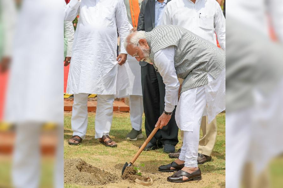Prime Minister Narendra Modi plants a sapling during the inauguration of Nalanda University, in Nalanda district, Bihar, Wednesday, June 19, 2024. Prior to the inauguration, Prime Minister Modi paid a visit to the Nalanda Mahavihara, located near the university.