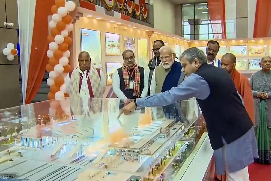 Prime Minister Narendra Modi with Uttar Pradesh Governor Anandiben Patel, Chief Minister Yogi Adityanath, Deputy Chief Minister Keshav Prasad Maurya and Union Railways Minister Ashwini Vaishnaw during the inauguration of redeveloped Ayodhya Dham Station.