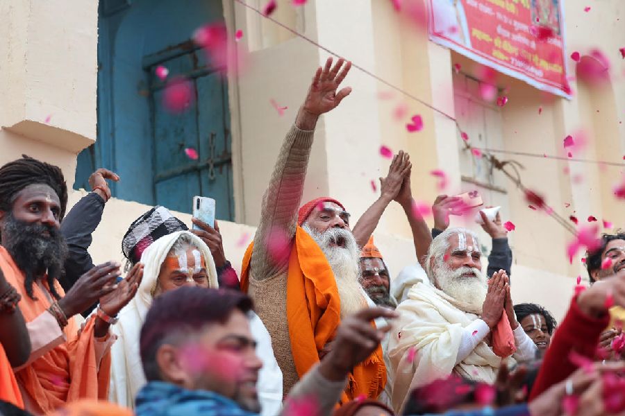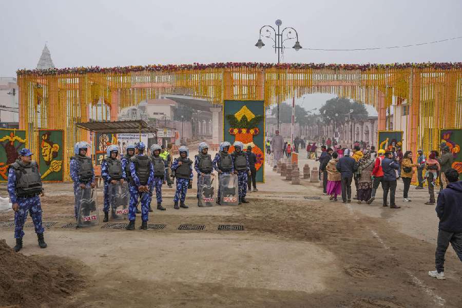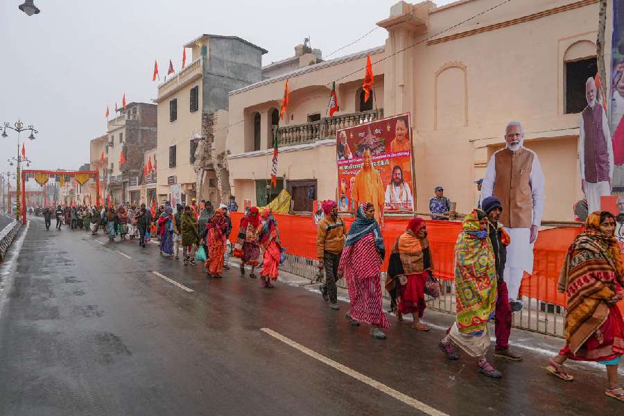 People arrive ahead of Prime Minister Narendra Modi's roadshow, in Ayodhya.