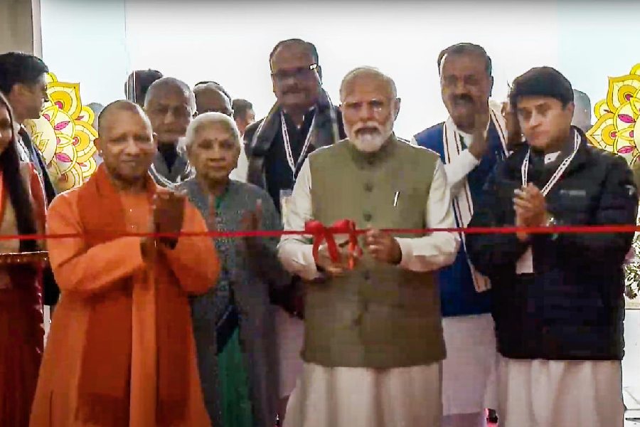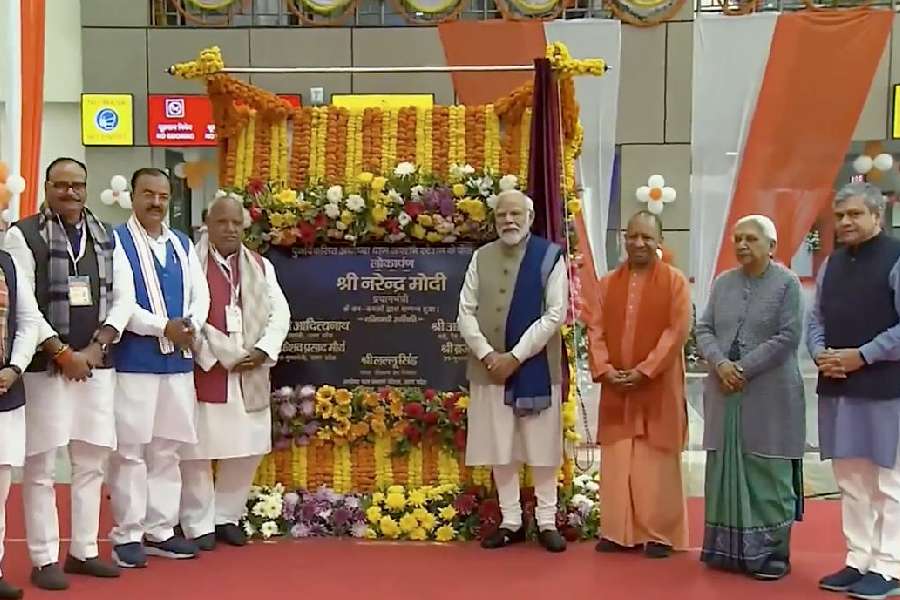 Prime Minister Narendra Modi with Uttar Pradesh Governor Anandiben Patel, Chief Minister Yogi Adityanath, Deputy Chief Minister Keshav Prasad Maurya, Union Civil Aviation Minister Jyotiraditya Scindia and others inaugurates Maharshi Valmiki International Airport.