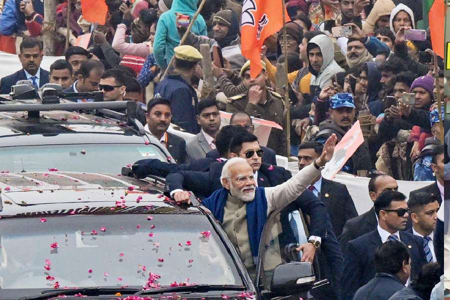 Prime Minister Narendra Modi waves to the gathering during a roadshow ahead of the inauguration of a redeveloped station and a newly-built airport.