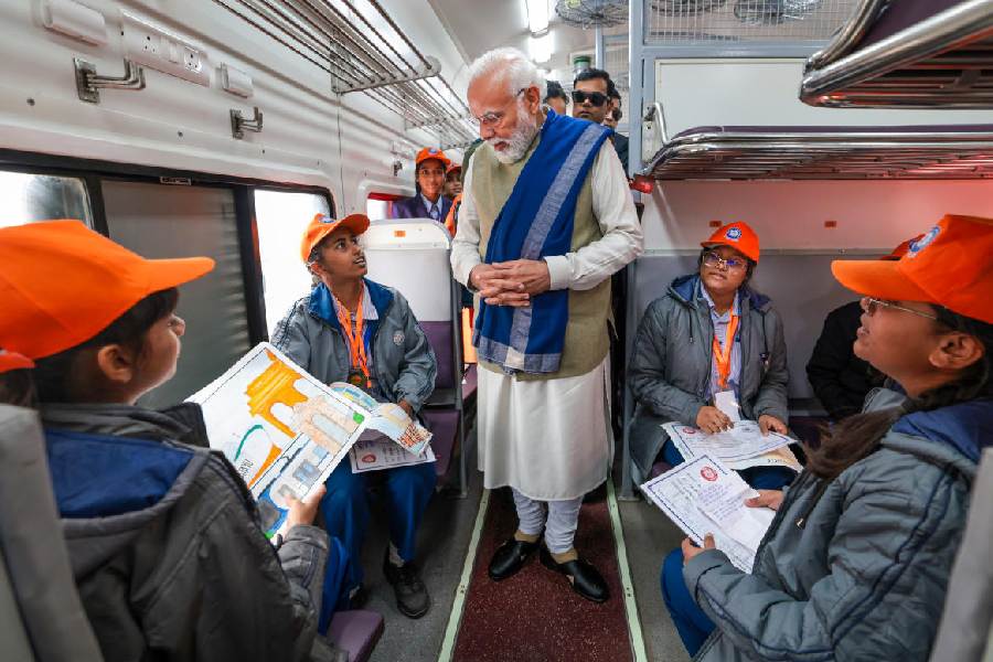 Prime Minister Narendra Modi interacts with passengers during the flag-off ceremony of Amrit Bharat train and inauguration of the redeveloped Ayodhya Dham Station.
