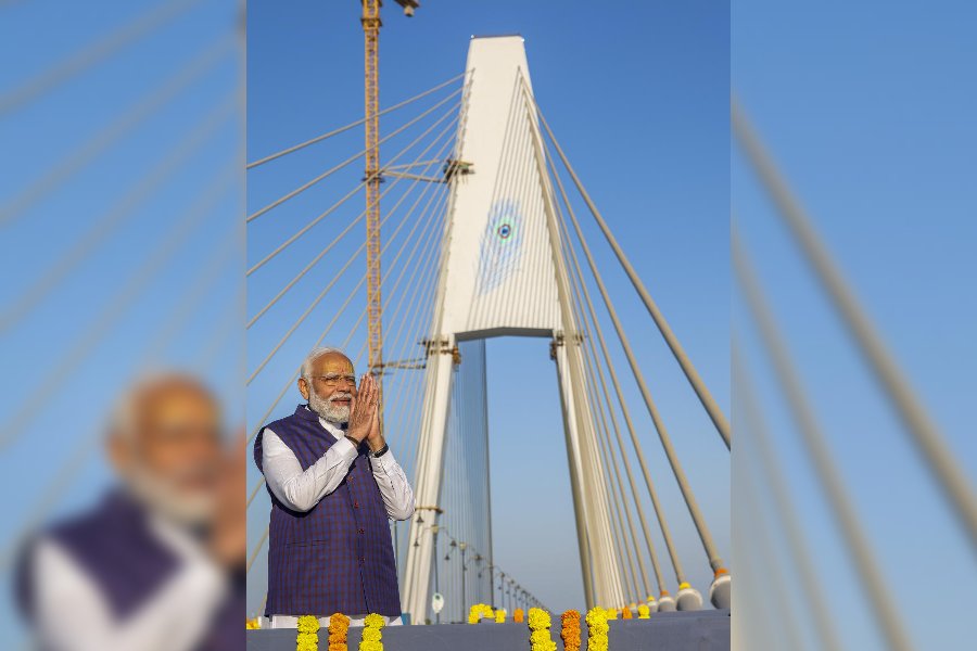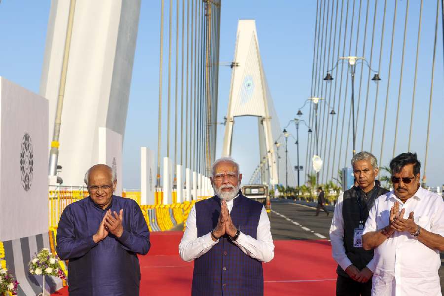 Prime Minister Narendra Modi during dedication of the Sudarshan Setu. The four-lane cable-stayed bridge boasts a unique design, featuring a footpath adorned with verses from Srimad Bhagavad Gita and images of Lord Krishna on both sides.