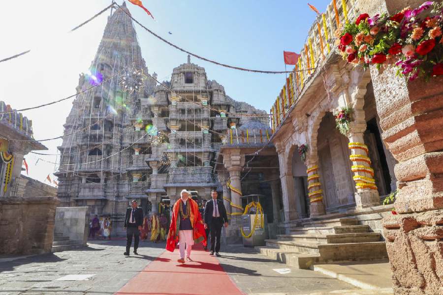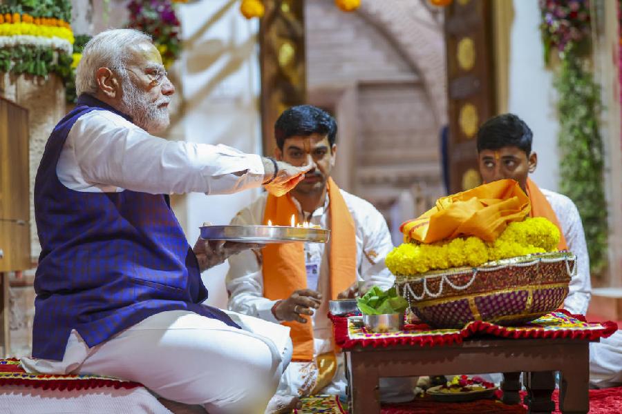 Prime Minister Narendra Modi offers prayers at the Beyt Dwarkadhish temple, in Dwarka. Beyt Dwarka is an island near Okha port, which is nearly 30 km from Dwarka town, where the famous Dwarkadhish temple of Lord Krishna is situated.