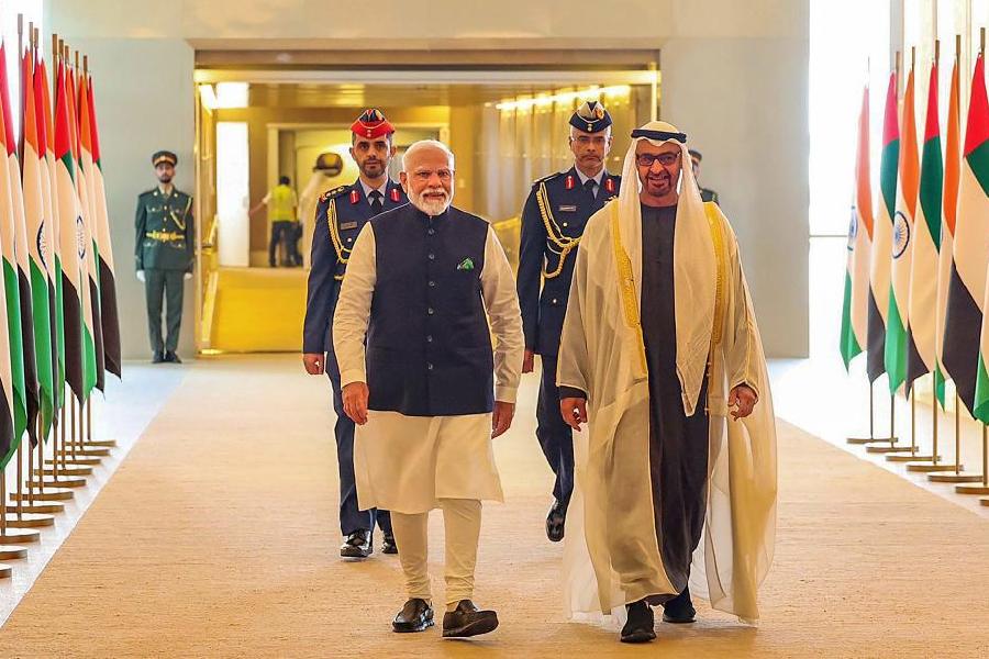 Prime Minister Narendra Modi with UAE President Mohamed bin Zayed Al Nahyan upon his arrival in Abu Dhabi. India and the UAE have inked 10 pacts for collaboration in key sectors like energy, infrastructure, investments, and management of archives.