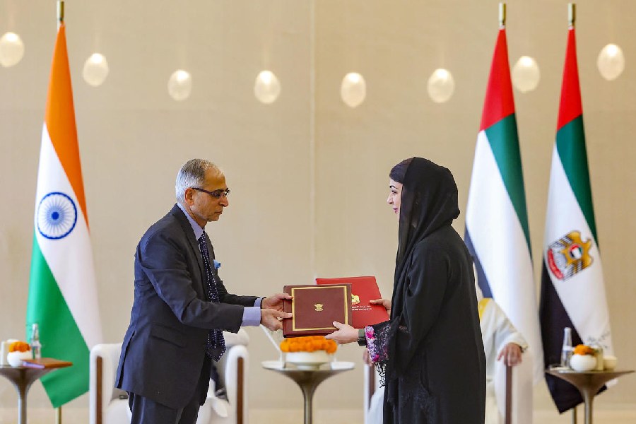 Foreign Secretary Vinay Kwatra and UAE Minister of State for International Cooperation Reem Al Hashemi exchange of MoUs during a meeting between Prime Minister Narendra Modi and UAE President Mohamed bin Zayed Al Nahyan. The MoU in the field of electricity interconnection and trade will focus on green hydrogen and energy storage, besides cooperation on ensuring energy security and trade.