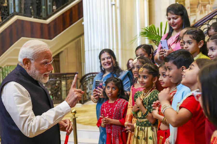 Prime Minister Narendra Modi with members of the Indian community upon his arrival at a hotel, in Abu Dhabi.
