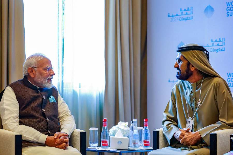 Prime Minister Narendra Modi with Vice President and Prime Minister of the UAE and Ruler of Dubai Sheikh Mohammed bin Rashid Al Maktoum during a meeting, in Dubai.